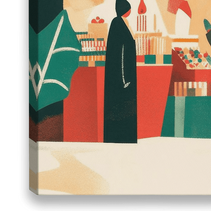 Een magisch winterwonderland ontvouwt zich: feestelijke kraampjes in felrood en zachte groentinten nodigen je uit om te snuffelen terwijl voetgangers door de vers gevallen sneeuw wandelen. Het zachte licht van de kerstversieringen creëert een warme sfeer, ideaal voor de woonkamer om de gezelligheid van het feestseizoen vast te leggen.