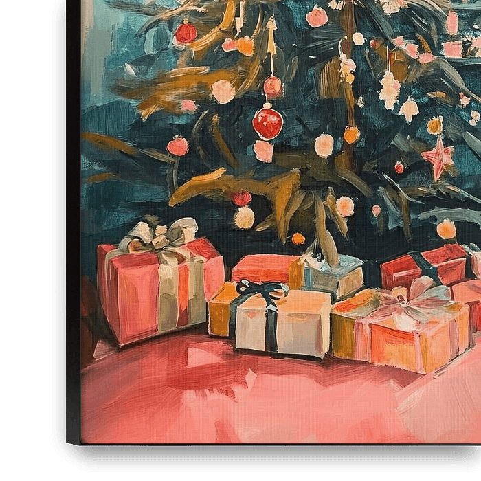 Kerstmis | Kerstboom met cadeaus - Dit kerst schilderij toont een rijkelijk versierde kerstboom met glimmende ballen en slingers, omringd door kleurrijke cadeaus in een warm verlichte kamer.