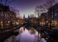 De Spiegelgracht met het Rijksmuseum met kerstverlichting, Amsterdam, Nederland. De Spiegelgracht is de mooist gedecoreerde gracht tijdens kerst.