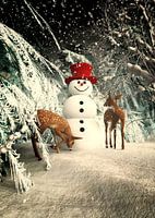 Wat een ontdekking! Twee herten ontdekken iets heel bijzonders in het bos.... Een witte man gemaakt van sneeuw met een rode hoed op; Wat is dat? vragen ze zich duidelijk af.
