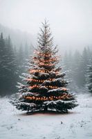 Een feestelijk versierde kerstboom schittert midden in een magisch winterlandschap, gehuld in zachte sneeuw en mystieke mist. De warme lichtjes geven het beeld een uitnodigende gezelligheid die perfect is voor een woonkamer waar familie en vrienden samenkomen om te genieten van de feestelijke sfeer.