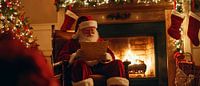 In een feestelijk versierde salon, warm verlicht door een flakkerend haardvuur, zit een knusse figuur in een rood gewaad. Omringd door liefdevol opgehangen kousen en glimmende lichtjes straalt het tafereel een uitnodigende, contemplatieve sfeer uit. Ideaal voor in de woonkamer om de voorpret van de feestdagen op te vrolijken.
