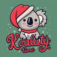 Een schattige koala met een kerstmuts en een rode sjaal, wat een warm en vriendelijk kerstthema suggereert. Onder de koala-afbeelding staan de woorden "Koalaty Time", die een speels en interessant tintje toevoegen. De achtergrond van de illustratie is groen, versierd met witte sneeuwvlokken.