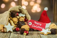 Koop de foto Kerstmis voedsel en snoepjes met rode kerstmuts en met tag tekst Merry Christmas van Alex Winter op canvas, aluminium dibond, (ingelijste) fotoprint, behang en ArtFrame, op maat geprint in Fine-Art kwaliteit.