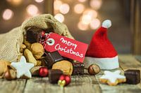 Over ‘Kerstmis voedsel en snoepjes met tag Merry Christmas en fonkelende lichten achtergrond’ van Alex Winter