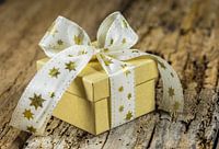 Over ‘Kerstmisgeschenk met witte stervormige lintboog op houten lijstachtergrond’ van Alex Winter