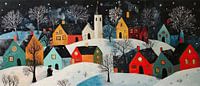 Kerstnacht | Winterdorp - Dit kerstschilderij toont een schilderachtig dorp bedekt met sneeuw, waar kleurrijke huizen met verlichte ramen warmte uitstralen tegen een donkere, sterren bezaaide nachtelijke hemel, terwijl sneeuwvlokken zachtjes naar beneden dwarrelen.
