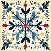 Kerstpatroon | Rode Bloem met Groene Bladeren - Dit kerst schilderij toont een symmetrisch patroon met planten en bloemen, centraal geplaatst rond een rode bloem, ondersteund door blauwe en groene bladvormen en kleine rode en gele details.