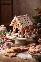 Te midden van glazuur en kleurrijk snoep schittert een verleidelijk peperkoekhuis vol liefde en feestelijkheid. Delicate zuurstokken en schattige kerstboompjes omlijsten deze eetbare kunst die de anticipatie op de feestdagen belichaamt. Perfect voor in de keuken, het voegt een warme, gezellige sfeer toe aan elke kamer.