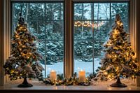 Een emotionele winterochtend ontvouwt zich achter glinsterende ramen, omlijst door feestelijk versierde dennenbomen. De lichtjes van de bomen en kaarsen gloeien zachtjes in de ijzige stilte. Buiten glinstert de sneeuw, terwijl binnen een gezellige feestelijke sfeer uitnodigt om te blijven hangen. Kerstmis heeft een magisch decor gecreëerd!