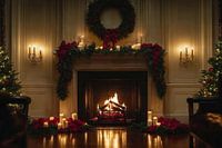 Een uitnodigende open haard schijnt in zachte lichtstralen, omlijst door feestelijk versierde sparrentakken en gloeiende kaarsen. De groene krans voegt een harmonieus accent toe, terwijl de kerstbomen op de achtergrond het gevoel van gezelligheid versterken. Dit schilderij is perfect voor de woonkamer, waar het warmte en feestvreugde verspreidt.