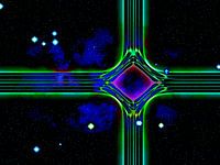 Moderne versie van de traditionele christelijke kerstster in de vorm van kruisende krachtlijnen met een gloeiend middelpunt in de duisternis van het universum