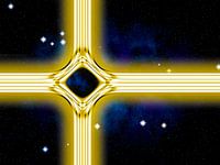 Moderne versie van de traditionele christelijke kerstster in de vorm van kruisende krachtlijnen met een gloeiend middelpunt in de duisternis van het universum