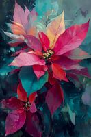 Een weelderige digitale interpretatie van kerststerren waarin diepe magentas en vurige roden contrasteren met een mysterieuze turquoise achtergrond. De bloemen zijn met een schilderachtige techniek weergegeven, waarbij de bladeren een bijna zijdeachtige textuur krijgen en zweven in een sfeervolle compositie die traditie en moderniteit…