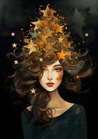 Portret van een prachtige vrouw op een contrasterende donkere achtergrond. In haar haren prachtige kerststerren in de vorm van een kerstboom. Passend bij kerst en winter.