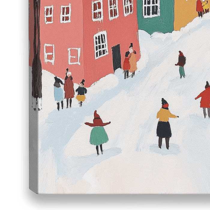 Kerststraat - Dit winterse landschap schilderij toont een charmante scene van kleurrijke huizen en vrolijke mensen actief in een besneeuwde dorpsstraat, omgeven door bomen en neerdwarrelende sneeuwvlokken, wat een sfeer van gezelligheid en feestelijkheid uitstraalt.