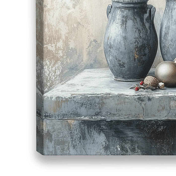 Kersttafel | Kerstsfeer - Dit kerststilleven schilderij toont een rustieke tafel versierd met keramische kruiken, een kerstkrans en een mand gevuld met dennen en rode bessen, waarbij de uitnodigende sfeer van de feestdagen geaccentueerd wordt door de warme, goud-bruine achtergrond.
