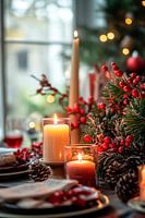 Sfeervol kaarslicht weerspiegelt de feestelijke sfeer van een prachtig gedekte eettafel, omlijst door sparrentakken en felrode bessen. Dit arrangement is ideaal voor de keuken of woonkamer en creëert een uitnodigende sfeer die familie en vrienden samenbrengt voor feestelijke momenten. Een vleugje warmte en gezelligheid vult de kamer.