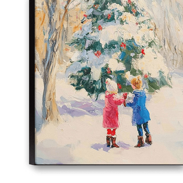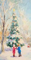 Kersttafereel | Sneeuw Kerstfeest - Dit kerst schilderij toont een versierde kerstboom middenin een besneeuwd landschap, waarbij twee kinderen in kleurrijke winterkleding elkaar aankijken en iets uitwisselen tegen een achtergrond van kale bomen en heldere luchten, met kleine figuren op de achtergrond die vermoedelijk kerstmis vieren.