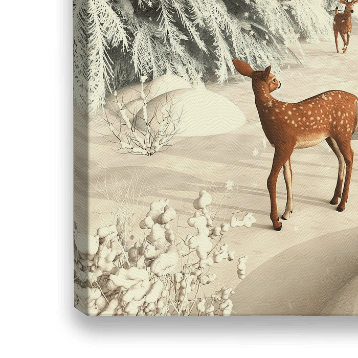 Een kersttafereel in het bos. Twee herten kijken om als een bok op hen afstapt; Het sneeuwt en de bomen zijn bedekt door de vallende sneeuw. Het is bijna avond en het licht heeft een warme gloed.