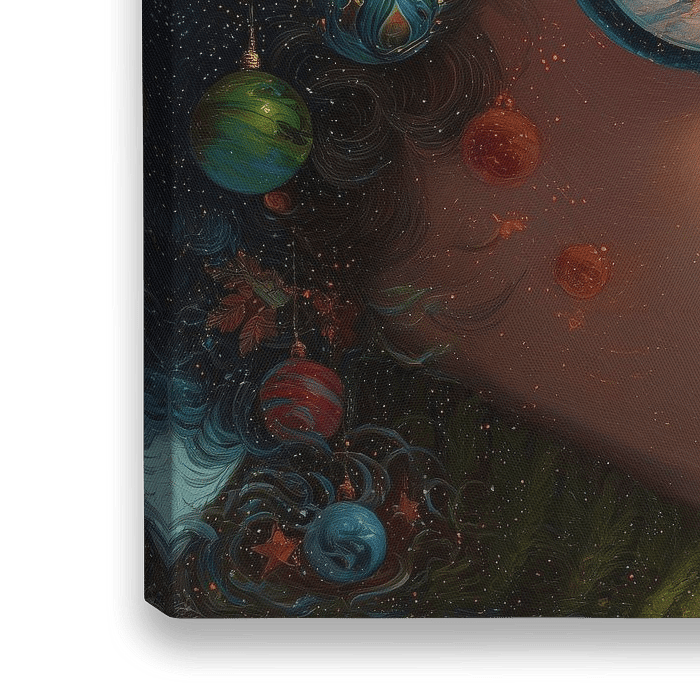 Techniek en sfeer: ik combineerde een realistisch portret met expressieve, bijna impressionistische accenten in de reflecties en het haar. Het gezicht zelf blijft zacht en sereen, met volle lippen en een neutrale uitdrukking die het spektakel in de glazen toelaat zonder afleiding. Door dit portret schilderij in combinatie met de bril en de kerstboom te plaatsen, ontstaat een gevoel van verwondering zonder sentimenteel te worden — een hedendaags, surrealistisch kerstwerk dat makkelijk in een modern interieur past. Het is een vrolijk, lichtvoetig winter schilderij dat je uitnodigt om vaker te blijven kijken en elke keer nieuwe details te ontdekken.