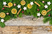 Kerstversiering op houten achtergrond met sparrenboomrand van Alex Winter