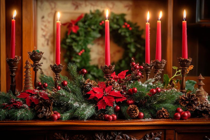Het kaarslicht straalt warm tussen sparrentakken en felrode kerststerren, terwijl het feestelijke arrangement met kegels en bessen een uitnodigende sfeer creëert. Deze harmonieuze compositie brengt nostalgische flair en gezelligheid - perfect voor de woonkamer om de voorpret van het feestseizoen te vieren.