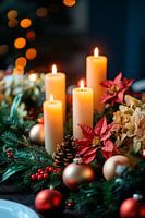 Een stralend geheel van elegant brandende kaarsen, omringd door feestelijke bloemen en glinsterende kerstballen, brengt een vleugje gezelligheid en kerstmagie. De harmonieuze combinatie van warme kleuren en natuurlijke elementen geeft elke ruimte een uitnodigende sfeer, ideaal voor een gezellige woonkamer of feestelijk versierde woonkamer.