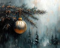 Details: kerstschilderij, kerstdecoratie, wintertafereel, gouden kerstbal, versierde dennentak, feestdagen, kerstsfeer, winterse achtergrond, kerstlichtjes, kunst