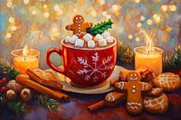 Een rode mok, versierd met winterse motieven, stroomt over van een heerlijk mengsel van zachte marshmallows en een lief peperkoekmannetje dat er gelukkig bovenop zit. Omringd door gouden lichtjes en geurige kaneelstokjes straalt het tafereel gezelligheid en feestelijke verwachting uit. De flikkerende kaarsen geven het geheel een…