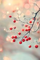 Helderrode bessen op tere takken gloeien in zacht licht, omhuld door zachte, wazige bokeh-effecten. Deze harmonieuze compositie brengt een vleugje natuur en kalme elegantie in elke kamer. Vooral in de woonkamer creëert het een uitnodigende sfeer en roept het een gezellige stemming op die uitnodigt om te blijven hangen.