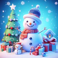 Een vrolijke sneeuwpop staat centraal in dit levendige kersttafereel. Hij is gehuld in een rood-witte sjaal en heeft een pluizige blauwe muts op. Zijn wortelneus en kolenlach stralen warmte uit. Hij staat trots naast een prachtig versierde kerstboom, omringd door kleurrijke cadeautjes versierd met strikken en linten. Een miniatuur sneeuwpop met kerstmuts zit vlakbij en draagt bij aan de feestelijke sfeer. Een charmant besneeuwd huis met gloeiende ramen komt tevoorschijn vanachter de cadeaus en maakt het plaatje van vakantiemagie compleet. De achtergrond van een fonkelende blauwe lucht en vallende sneeuwvlokken versterkt de algehele betovering.