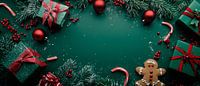 Een harmonieus samenspel van feestelijke kleuren ontvouwt zich: felrode kerstballen en glanzende cadeautjes omlijsten een liefdevol ontworpen peperkoekman. De groene achtergrond geeft een gevoel van gezelligheid en feestelijkheid. Deze afbeelding geeft de keuken of woonkamer een feestelijke sfeer en brengt kerstsfeer in elk hart.