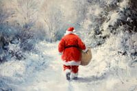 Midden in een besneeuwd winterlandschap stapt een nostalgische figuur in felrood, gehuld in zachte witte tinten, naar voren. Zijn brede, behaaglijke jas steekt indrukwekkend af tegen de koude omgeving. Op zijn rug draagt hij een grote zak vol mysterieuze schatten. Er hangt een vleugje magie in de heldere lucht terwijl hij wegglijdt uit de magie van Kerstmis.