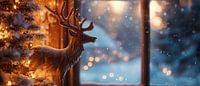 Een majestueus hert, zachtjes verlicht door feestelijke lichtjes, staat trots op de voorgrond terwijl de winterse magie door het raam naar binnen stroomt. Buiten dansen de sneeuwvlokken en creëren een magische sfeer. Dit schilderij geeft een warme, contemplatieve touch aan elke woonkamer en nodigt uit om te blijven hangen en te dromen.
