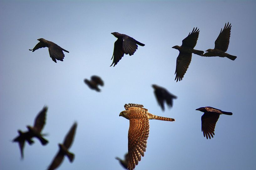 opgeschrikt door de kraaien, vloog de torenvalk, op de loer voor een prooi