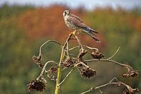 Torenvalk op een verwilderde zonnebloem