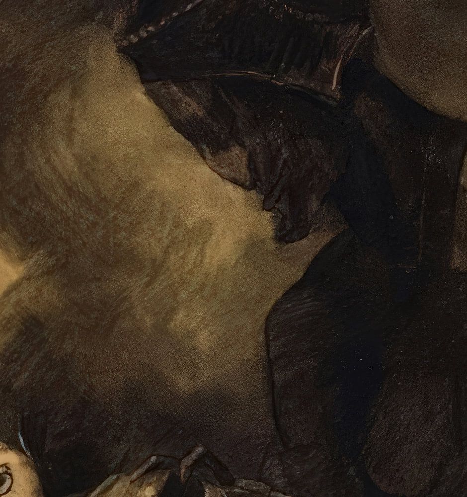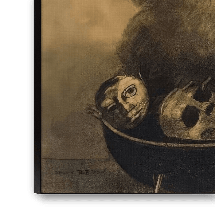 Het beklemmende en raadselachtige werk van Odilon Redon trekt de kijker het rijk van het macabere en het bovennatuurlijke binnen. Deze sombere houtskool- en krijttekening straalt een aura van mysterie en voorbode uit en nodigt ons uit om de confrontatie aan te gaan met de duistere onderstromen van de menselijke psyche.