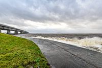 Ketelbrug in Flevoland tijdens een winterstorm over het IJsselmeer. De Ketelbrug is het punt waar het Ketelmeer en het IJsselmeer samenkomen en waar de snelweg A6 de Noordoorstpolder met Oost Flevoland verbindt.