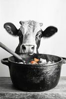Een humoristisch samenspel van dieren en culinaire hoogstandjes: een nieuwsgierige koe kijkt aandachtig in een grote kookpot terwijl kleurrijke ingrediënten wachten om getransformeerd te worden. De contrastrijke zwart-wit look geeft een charmante vintage flair en is perfect voor de keuken - een blikvanger voor elke kookliefhebber!