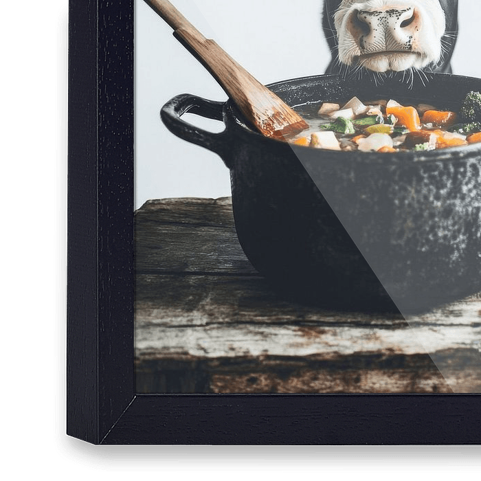 Stel je een ondeugende koe voor die nieuwsgierig toekijkt terwijl jij kookt! Het contrast tussen de rustieke pot vol verse ingrediënten en de brutale blik van het dier creëert een vrolijke sfeer. Dit kunstwerk is perfect voor in de keuken, brengt een dosis humor en levendigheid in je kookhoek en inspireert tot culinaire avonturen!