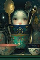 Keuken | Innocence Amidst the Silver - Dit surrealistische schilderij toont een groot kindergezicht dat mysterieus verschijnt temidden van kleurrijke en rijkelijk gedecoreerde serviesgoederen zoals kommen en lepels, weerspiegelt een wereld die zowel kinderlijk onschuldig als diep sereen is.