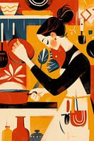 Keuken | Stir of Artistry - Dit vrouwen schilderij toont een elegante dame die geconcentreerd bezig is met het roeren in een helderrode kookpot in een kleurrijke keukenomgeving, omgeven door modernistische patterns en levendige kleuren.