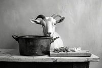 Een charmant stilleven van rustiek hout en een mysterieuze pot, waar nieuwsgierigheid en gezelligheid vanaf stralen. De opvallende horens van de geit geven het tafereel een speels tintje, terwijl de verse ingrediënten op de voorgrond verwijzen naar de culinaire actie. Dit kunstwerk zou prachtig staan in een moderne keuken en een gesprek…