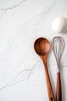 Een harmonieuze opstelling van een elegante houten schop en een gebogen garde, aangevuld met een helder wit ei, nodigt je uit om creatief te worden met koken. De zachte kleuren en heldere structuur van de marmeren achtergrond geven het tafereel een tijdloze elegantie, ideaal voor een moderne keuken. Een blikvanger die culinaire…