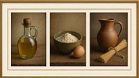 Een charmant drieluik met olijfolie, bloem met ei, en rustieke kruik met pasta, stijlvol omlijst in goud. Perfect voor een landelijke of klassieke keuken, met zachte aardetinten en een warme uitstraling.