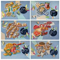 Ik heb de producten in 6 groepen gegroepeerd en in schetsstijl getekend met inkt en wit potlood op kraftpapier met collage-elementen van gekleurd kraftpapier.