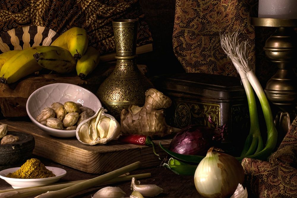 Ik ging aan de slag en koos voor de basis kruiden van Indische gerechten die ik ken. Uien knoflook, pepers en andere kruiden. Daarnaast enkele textielen en voorwerpen die we zelf op vakantie in Indonesië hebben gekocht.
