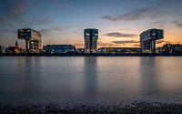 Kraangebouwen bij de haven Rheinau aan de Rijn, avondsfeer in Keulen, Noordrijn-Westfalen, Duitsland