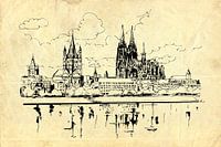 Pen en inkt tekening op oud inpakpapier als textuur - digitaal bewerkt. In het uitzicht uit de jaren zeventig, met de Rijn op de voorgrond, loopt de blik van de toren van het stadhuis links naar de Sint-Martinuskerk en de Dom van Keulen.